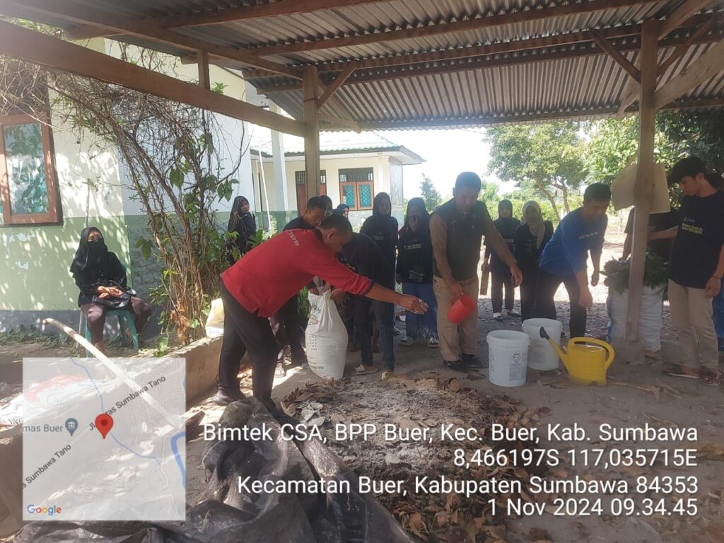 Pada hari kedua, pelatihan berlanjut dengan praktik pembuatan pupuk kompos menggunakan bahan-bahan yang telah disiapkan, seperti seresah daun kering, jagung, kohe, dedak, kapur dolomit, dan EM4 sebagai dekomposer. Aktivitas ini tidak hanya memberikan keterampilan praktis, tetapi juga menanamkan kesadaran akan pentingnya pengelolaan sumber daya secara berkelanjutan.