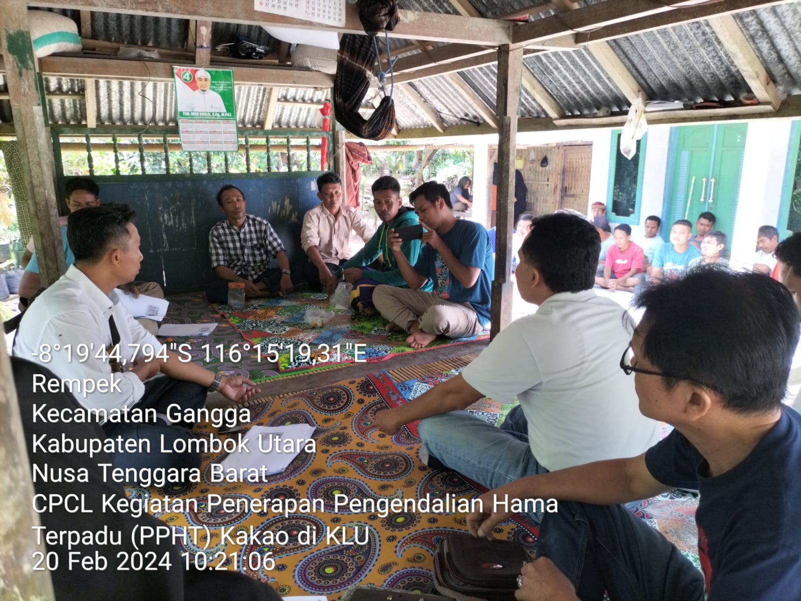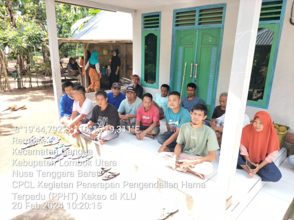 Balai Perbenihan dan Perlindungan tanaman perkebunan melakukan kegiatan pemantapan CPCL Kegiatan PPHT Tanaman Kakao di kelompok tani Harapan Maju dan Mudi Jari Desa Rempek kecamatan Gangga kabipaten lombok utara dengan luasan 50 Ha