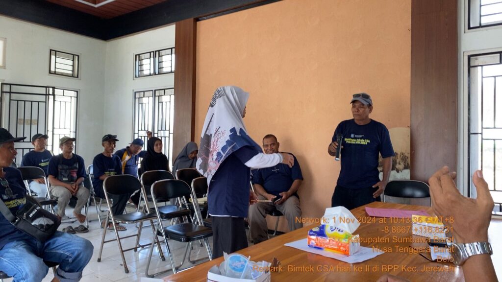 Acara dibuka secara resmi oleh Koordinator Penyuluh Kecamatan Jereweh, yang didampingi oleh Koordinator Penyuluh Kabupaten Sumbawa Barat. Sebelum pelatihan dimulai, peserta melakukan pretest untuk mengukur pengetahuan awal mereka. Materi yang disampaikan oleh tim Bapeltanbun meliputi inovasi teknologi CSA, teknologi hemat air, penggunaan varietas unggul, dan bahan organik sebagai pembenah tanah.