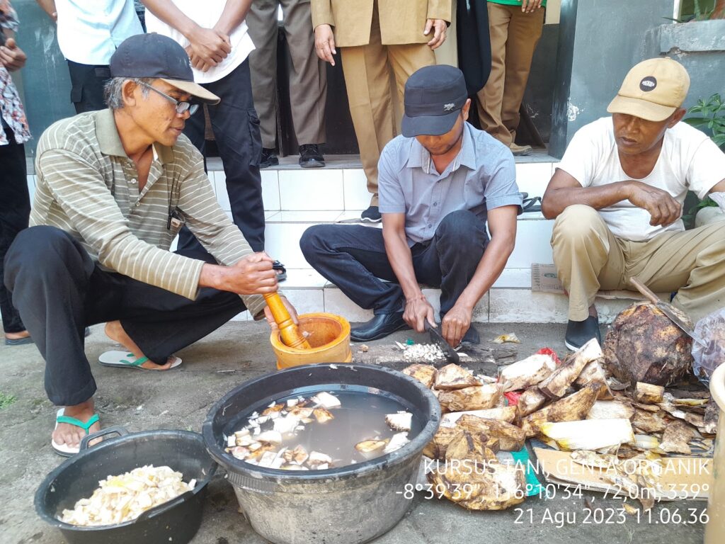 Kegiatan Sekolah Lapang Tematik Pertanian Organik merupakan salah satu upaya mendukung pemberdayaan petani, penerapan dan diseminasi inovasi teknologi pertanian sehingga dilaksanakan kursus tani dalam pembuatan Mikro Organisme Lokal (MOL). Terlihat peserta Kursus tani antusias dalam menghadiri dan menerima pembelajaran mengenai MOL serta praktik langsung pembuatan MOL dengan bahan yang berasal dari bonggol pisang, larutan gula merah dan cucian air beras.