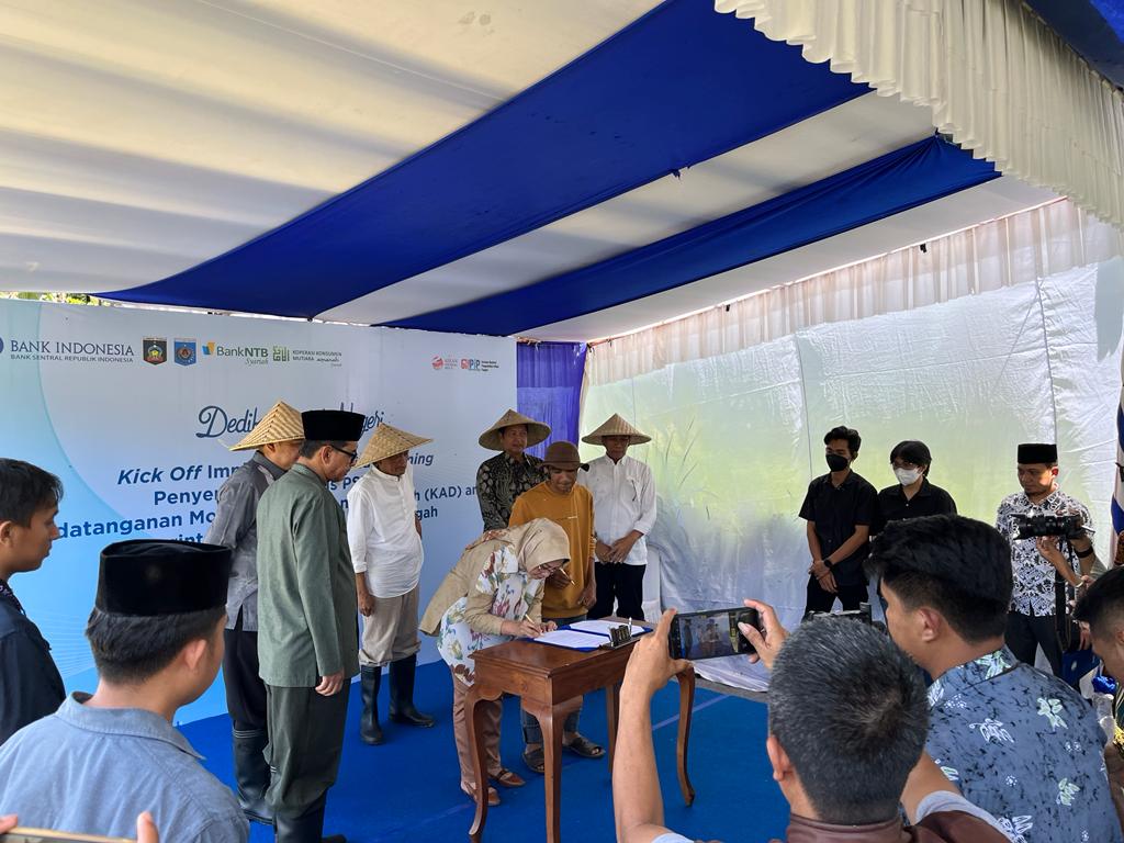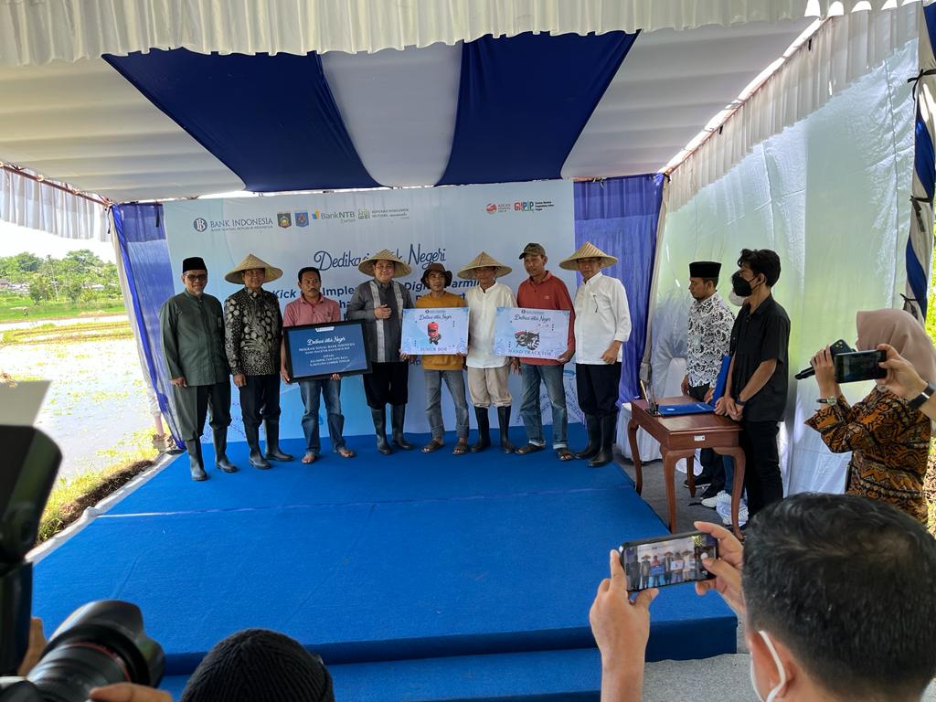Kepala Dinas Pertanian dan Perkebunan Prov. NTB Dr.H.Fathul Gani, M.Si bersama Bupati Loteng, Pimpinan Perwakilan Bank Indonesia Prov.NTB, Asisten 2 Pemkot Mataram, Dirut Bank NTB Syariah, Pimpinan OPD Pemkab Loteng & Pemkot Mataram serta anggota Poktan Sapurata Lombok Tengah mengikuti Kick off implementasi digital farming, penandatanganan perjanjian antara Pemkab Loteng & Pemkot Mataram, penandatanganan kerjasama B to B antara poktan Sapurata selaku produsen beras dengan koperasi pegawai Bank NTB Syariah selaku offtaker.