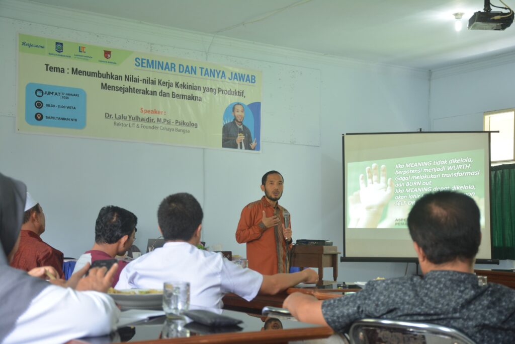 Balai Pelatihan Pertanian dan Perkebunan (BAPELTANBUN ) NTB menghadirkan Seminar dan Tanya Jawab mengangkat tema Menumbuhkan Nilai – Nilai Kerja Kekinian yang Produktif, Mensejahterakan dan Bermakna dengan menghadirkan Narasumber Dr. Lalu Yulhaidir, M.Psi (Psikolog) sekaligus Rektor LIT dan Founder Cahaya Bangsa bertempat di BAPELTANBUN NTB.