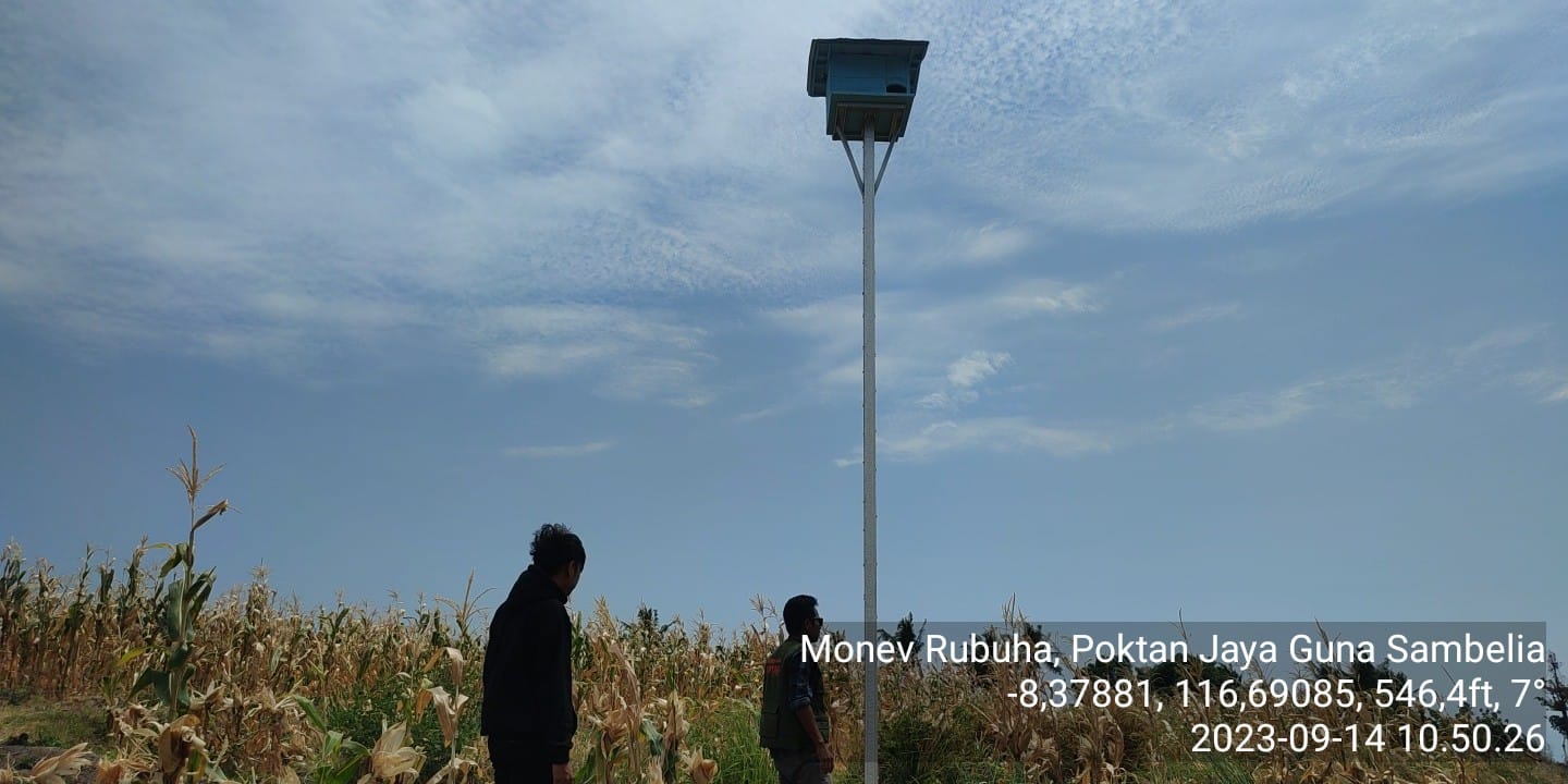 Tim Seksi Perlindungan Tanaman Pangan (PTP) UPTD Balai Perlindungan Tanaman Pertanian (BPTP) Dinas Pertanian dan Perkebunan Provinsi Nusa Tenggara Barat (NTB) melakukan kegiatan Monitoring dan Evaluasi (MONEV) manfaat dari Rumah Burung Hantu (RUBUHA) di Kelompok Tani (POKTAN) Jaya Guna di Sambalia Lombok Timur.