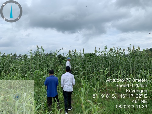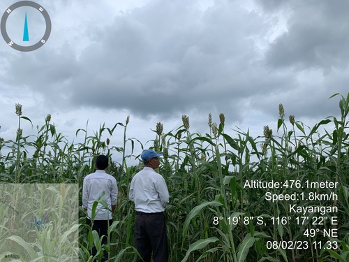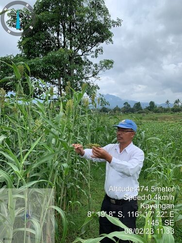Tim UPTD BPSB Pertanian melakukan pemeriksaan lapangan benih sorgum varietas suri 3 di Unit Perbanyakan Benih (UPB) Santong, Kab. Lombok Utara.