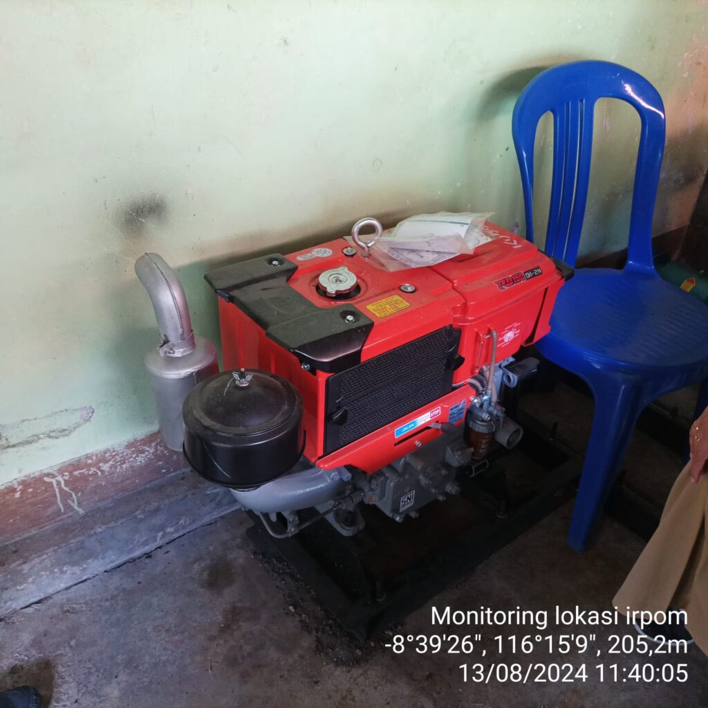 Hasil monitoring menunjukkan bahwa bantuan irpom berupa mesin pompa air 6 inch telah diterima oleh kelompok tani. Sumber air dari sungai sudah tersedia untuk mengairi lahan seluas 25 hektare, namun pemasangan pompa belum dilakukan karena lokasi yang cukup jauh dan belum dibangunnya dudukan pompa. Rencananya, dudukan pompa akan dibangun dengan ukuran 2×2 meter, dan pemasangan irpom akan didampingi oleh konsultan.