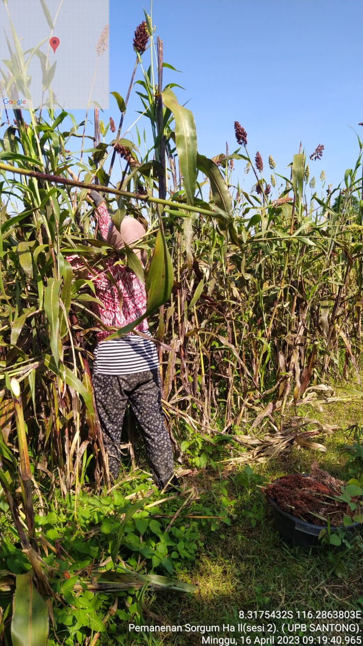 Hari ini Senin tanggal 17 April 2023 melaporkan telah melaksanakan kegiatan panen lanjutan II sorgum varietas Suri 3 kelas benih BD-BP dari sumber anggaran APBN yang sebelumnya dinyatakan lulus lapangan dari hasil pemeriksaan oleh tim BPSB Prov. NTB yang didampingi oleh tim BBIP kasi pangan seluas 2.0 ha. kegiatan panen shirgum yang berlokasi di santong desa Santong Kec. Kayangan Kab. Lombok Utara dengan tujuan panen untuk mengetahui hasil produksi dalam satuan kilo gram dalam satuan luas areal panen yang dilakukan secara manual oleh tenaga harian lepas yang dikoordinir oleh tenaga tekhnis UPB Santong.