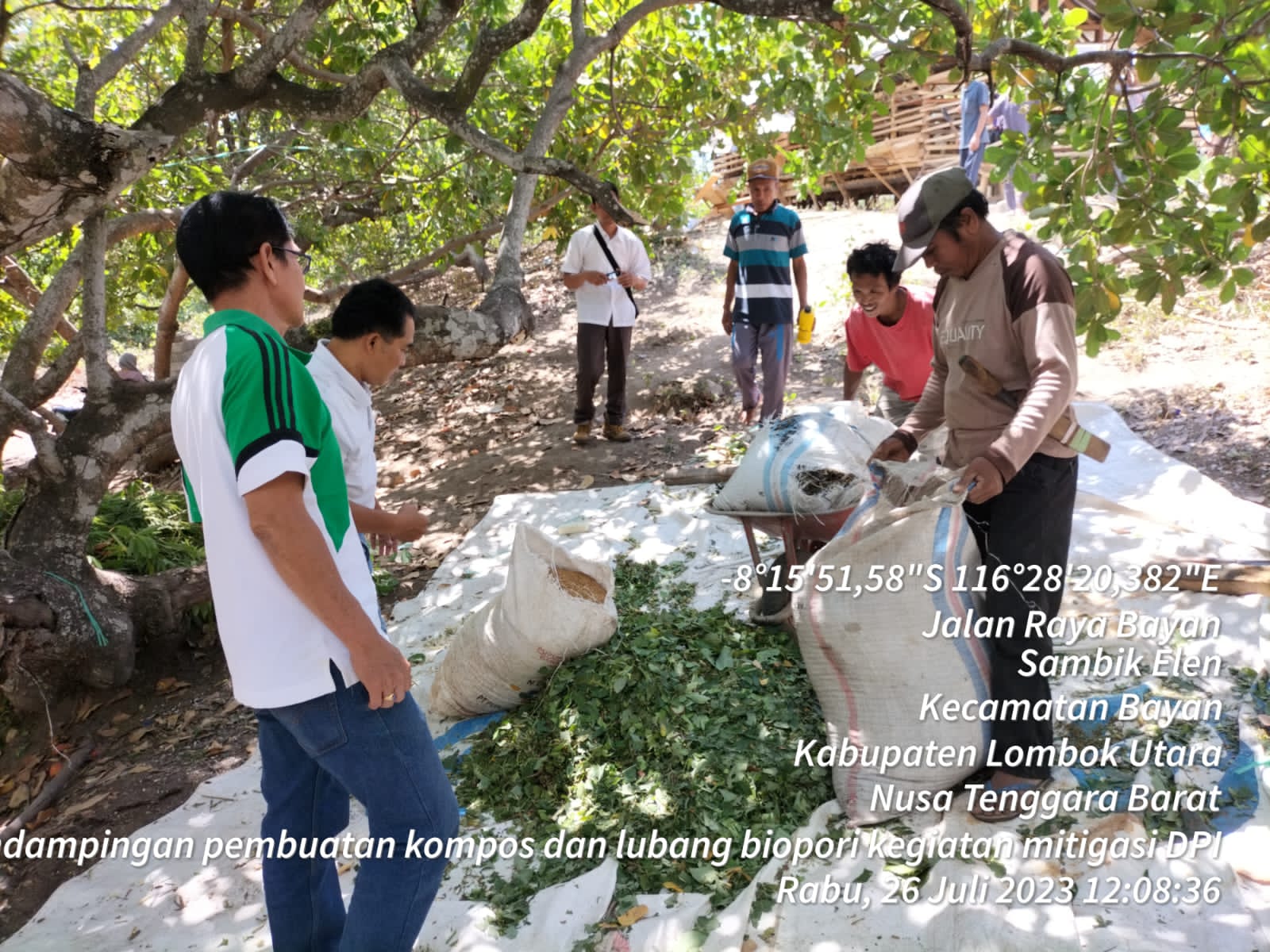 Tim Proteksi Balai Perbenihan dan Perlindungan Tanaman Perkebunan Melakukan kegiatan Pendampingan Pelatihan pembuatan Kompos, Lubang Biopori, pemangkasan dan pembuatan rorak di kelompok tani bunga mekar sebagai kelompok tani penerima bantuan kegiatan mitigasi dampak perubahan iklim di desa sambik elen kecamatan bayan Lombok Utara.