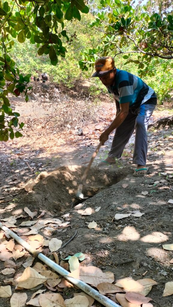 Kompos dibuat dari kotoran kambing dari kambing yang juga merupakan paket bantuan kegiatan mitigasi DPI, dicampur dengan daunan hijau, sekam dan EM4 dan gula pasir sebagai pengurai kemudian nnti disimpan selama 2 minggu. Lubang biopori dibuat dengan kedalaman 30 cm sebanyak 4 lubang masing-masing pohon dan nnti diisi dengan pupuk kompos yang sudah jadi.