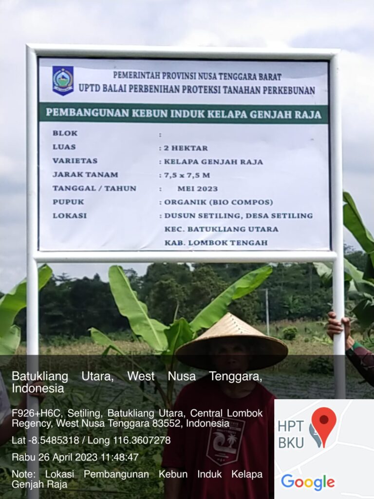 Jumat, 28 April 2023, Kepala Balai Perbenihan dan Proteksi Tanaman Perkebunan Provinsi NTB dan Tim Perbenihan Melakukan pemasangan plank kegiatan pembangunan kebun Induk Kelapa Genjah Raja seluas 2 Ha dengan jarak tanam 7.5 x 7.5 m. berlokasi di dusun setiling desa setiling kecamatan batukliang utara kebupaten lombok tengah.
