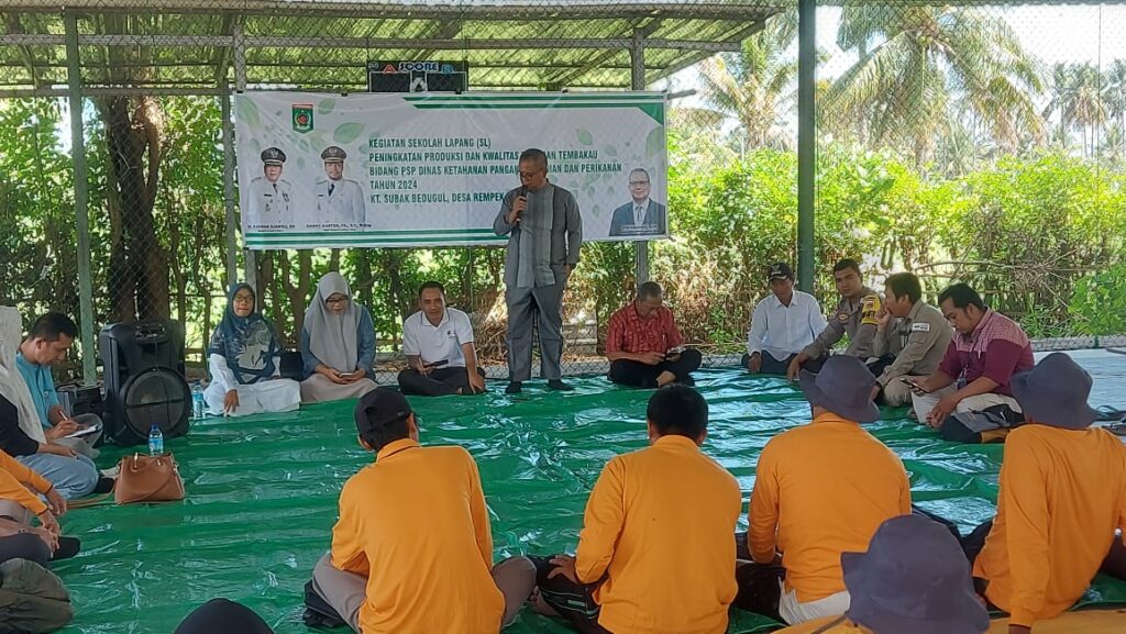 Lombok Utara, 6 September 2024 — Tim Narasumber Widyaswara dan Penyuluh dari Balai Pelatihan Pertanian dan Perkebunan (Bapeltanbun) NTB menghadiri pembukaan Sekolah Lapang (SL) untuk peningkatan produksi dan kualitas tanaman tembakau yang diselenggarakan di Kelompok Tani Subak Bedugul, Desa Rempek, Kecamatan Gangga, Kabupaten Lombok Utara. Acara tersebut dihadiri oleh Kepala Dinas Ketahanan Pangan, Pertanian dan Perikanan (DKP3) Kabupaten Lombok Utara Tresnahadi, S.Pt, beserta jajaran, Camat Gangga, Kepala Desa Rempek dan beberapa tokoh penting lainnya.