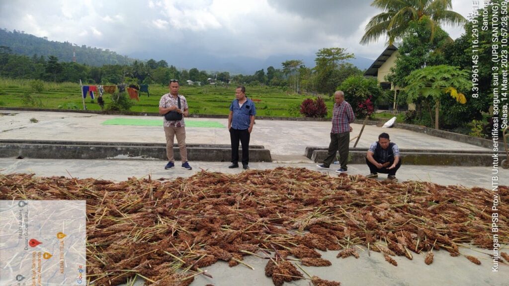 Perkembangan kegiatan perbanyakan benih sorgum MH. 2022-2023 di UPB Santong dengan varietas Suri 3, kelas benih BD-BP seluas 2,0 ha, telah memasuki fase masak / penuaan yang kegiatannya bersumber dari anggaran APBD. Hari ini Senin tanggal 14 Maret 2023 telah dilaksanakan pemeriksaan lanjutan oleh tim dari BPSB Prov.