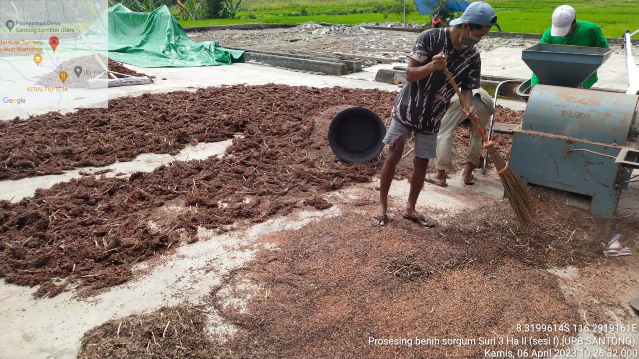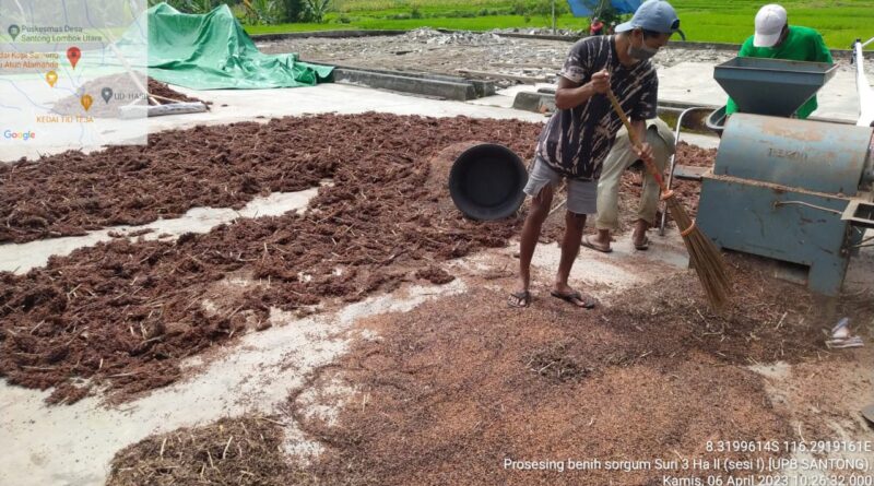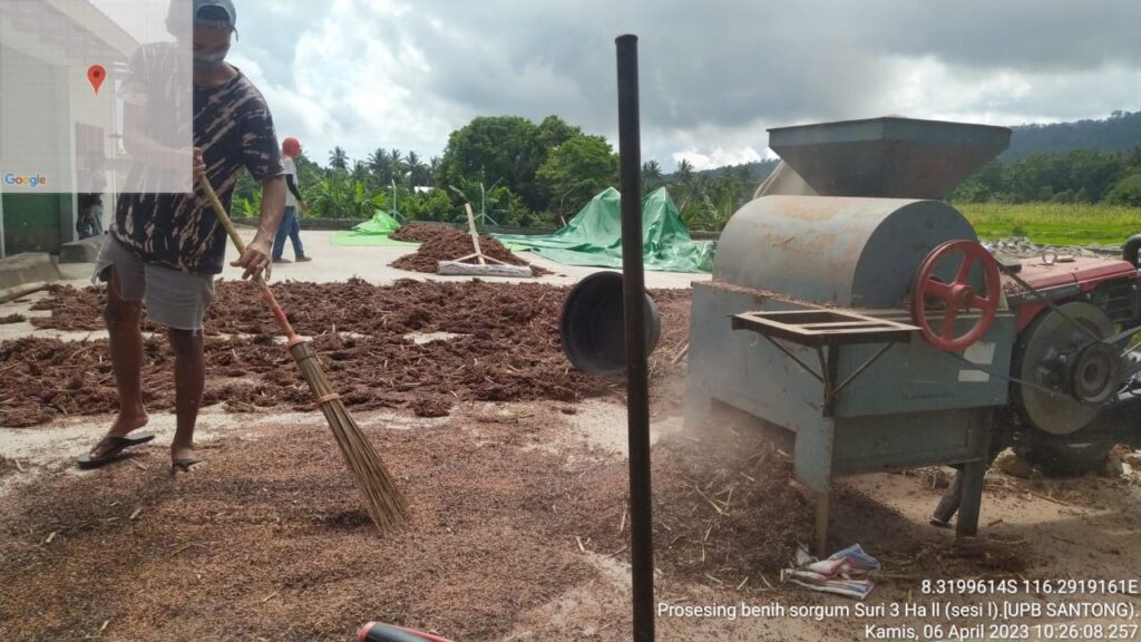 Hari ini Jum’at tanggal 7 April 2023 dilaporkan bahwa telah melaksanakan kegiatan penanganan Pasca panen bahwa di UPB Santong melaksanakan kegiatan pemipilan shorgum menggunakan power treser yang di laksanakan oleh tim tekhnis UPB yang berlokasi di Santong Desa Santong Kec. Kayangan Kabupaten Lombok Utara. Dengan tujuan perontokan/pemipilan Untuk memisahkan biji dengan tangkai malai shorgum menggunkan tresert Dan selanjutnya dilakukan pengipasan menggunakan seed clianer memisahkan kotoran benih Guna menghasilkan kwalitas dan mutu benih yang di hasilkan