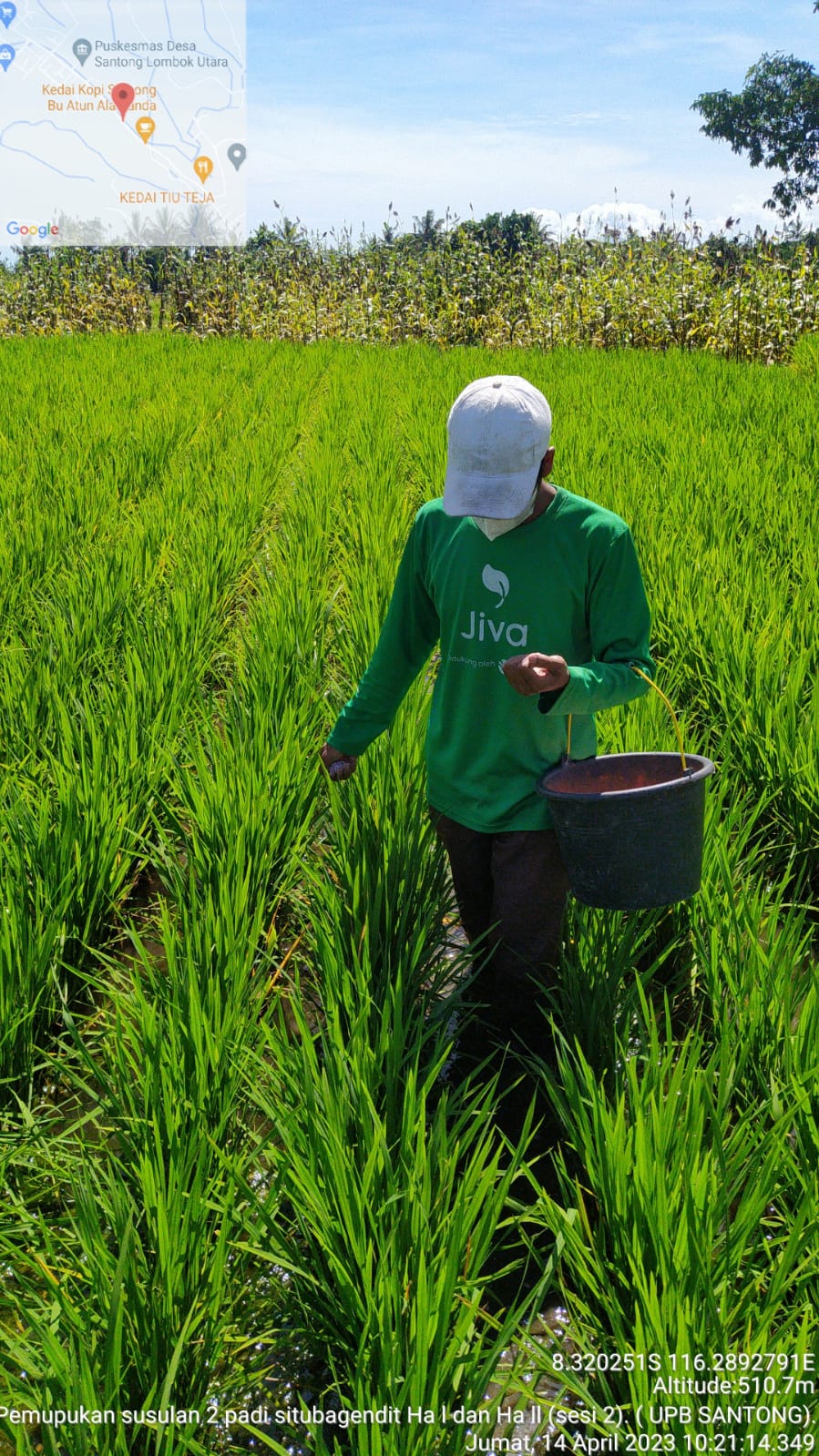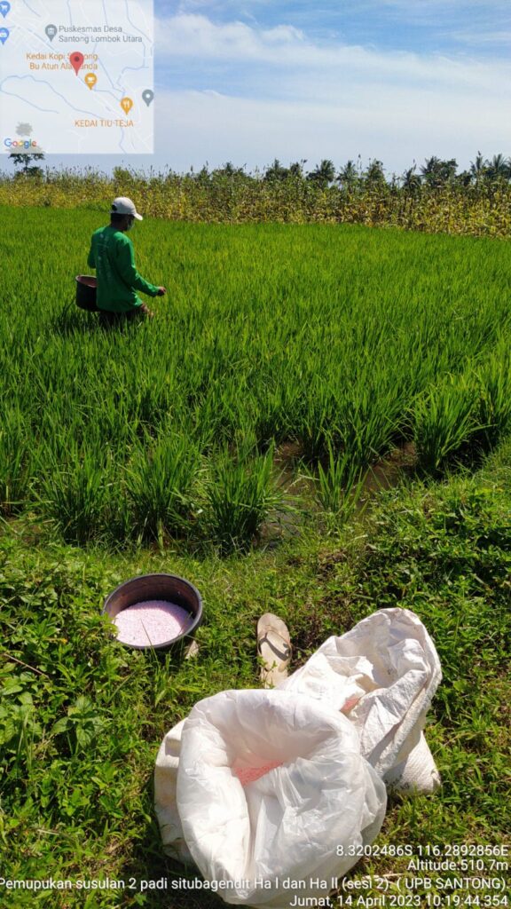 Kegiatan perbanyakan benih padi MH. 2022- 2023. Di UPB Santong hari ini Jum’at 14 April 2023 telah melaksanakan kegiatan pemupukan susulan I di pertanaman Padi varietas Situ bagendit kelas benih BD-BP untuk areal luasan 1.0 Ha. Yang bersumber dari anggaran APBD di lokasi perbanyakan benih padi di Santong Desa Santong Kec. Kayangan Lombok Utara yang di laksanakan oleh tenaga tekhnis karyawan UPB Santong.