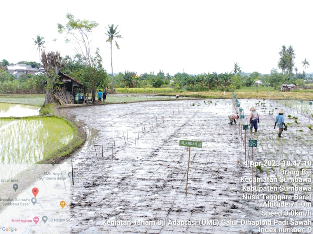 Selasa, 4 April 2023. Penanaman galur padi kegiatan Uji Adaptasi Varietas di Kabupaten Sumbawa, yang terdiri dari 12 Galur Harapan (GH), 2 Kontrol (Inpari 32 & 42), dengan 3 Ulangan. Berdasarkan tugas pokok Balai Pengawasan dan Sertifikasi Benih Pertanian (BPSB-P) Provinsi Nusa Tenggara Barat sebagai salah satu institusi pemerintah yang diberi kewenangan untuk melaksanakan kegiatan adaptasi varietas. Agar galur/mutan/hibrida/ klon yang diuji dapat diketahui potensi dan karakternya maka adaptasi pelepasan varietas harus dilakukan sesuai dengan persyaratan teknis yang ditetapkan dan sesuai dengan peraturan yang berlaku.