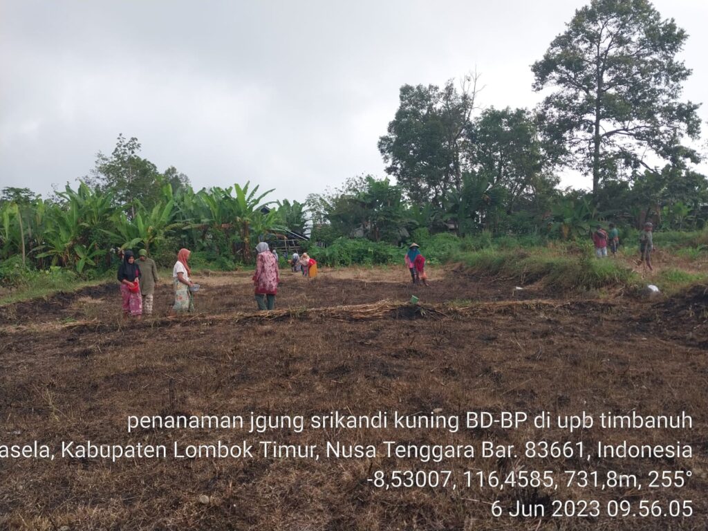 Pelaksanaan program kegiatan perbanya kan benih sumber palawija di UPB Timbanuh pringgasele pada hari ini selasa tanggal 6 Juni 2023 telah melaksankan penanaman jagung varietas Srikandi kuning seluas 2.0 ha. kelas benih BD-BP dari anggaran APBN di lokasi Bukit Tinggi Desa Sambelia kec.Sambelia kab. Lombok Timur, yang dilaksanakan oleh tenaga harian lepas yang dikoordinir langsung oleh tenaga tekhnis UPB, penanaman dilakukan dengan cara ditugal sesuai jarak tanam yang telah direkomendasikan, tujuannya agar benih tanaman tumbuh dan kembang dengan normal untuk mendapatkan hasil produksi maksimal dalam mencapai terget produksi benih.