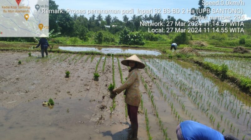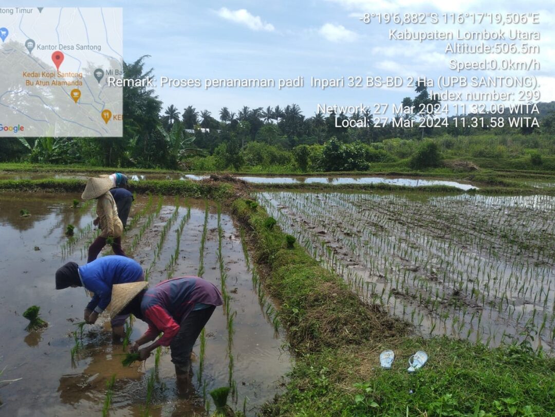 Salah satu kegiatan yang dilakukan adalah proses perbanyakan benih sumber padi di UPB Santong, yang terletak di Desa Santong, Kecamatan Kayangan, Kabupaten Lombok Utara. Pada hari Rabu, tanggal 27 Maret 2024, UPB Santong melaksanakan kegiatan penanaman bibit padi varietas Inpari 32, kelas benih BS-BD. Kegiatan ini dilakukan dengan tujuan untuk mempercepat pertumbuhan dan perkembangan tanaman pada areal tanam yang lebih luas, dengan jumlah populasi tanaman yang maksimal.