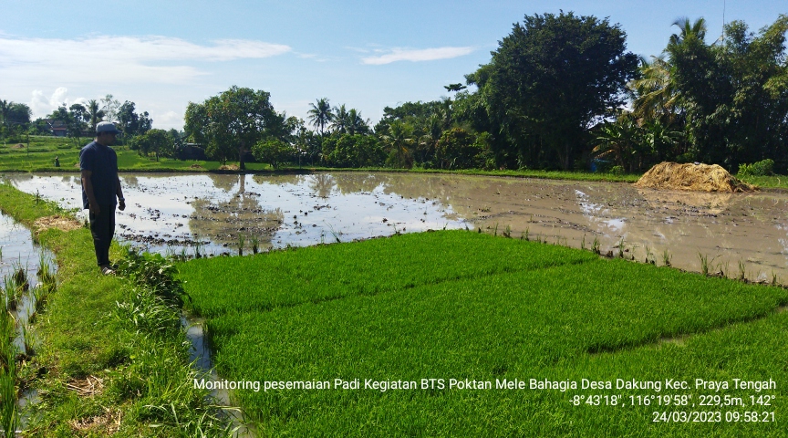 Pendampingan Kegiatan Dem Area BTS untuk Pengendalian OPT pada Tanaman Padi dengan agenda Pengamatan Persemaian, umur 18 hss dengan keadaan OPT masih aman dan terkendali, selanjutnya pendampingan dalam pengolahan tanah sekaligus mengumpulkan jerami sisa panen untuk nantinya akan dikembalikan ke lahan setelah diolah menjadi kompos, dan sekaligus mendampingi petani dalam melakukan penanaman padi dengan sistem jarwo dan konvensional, di kelompok penerima bantuan yaitu Poktan Mele Bahagia desa dakung dan Poktan Ingin Maju Kel. Gerantung Kec. Praya Tengah, kegiatan ini juga melibatkan petugas POPT, dan PPL Wkpp.