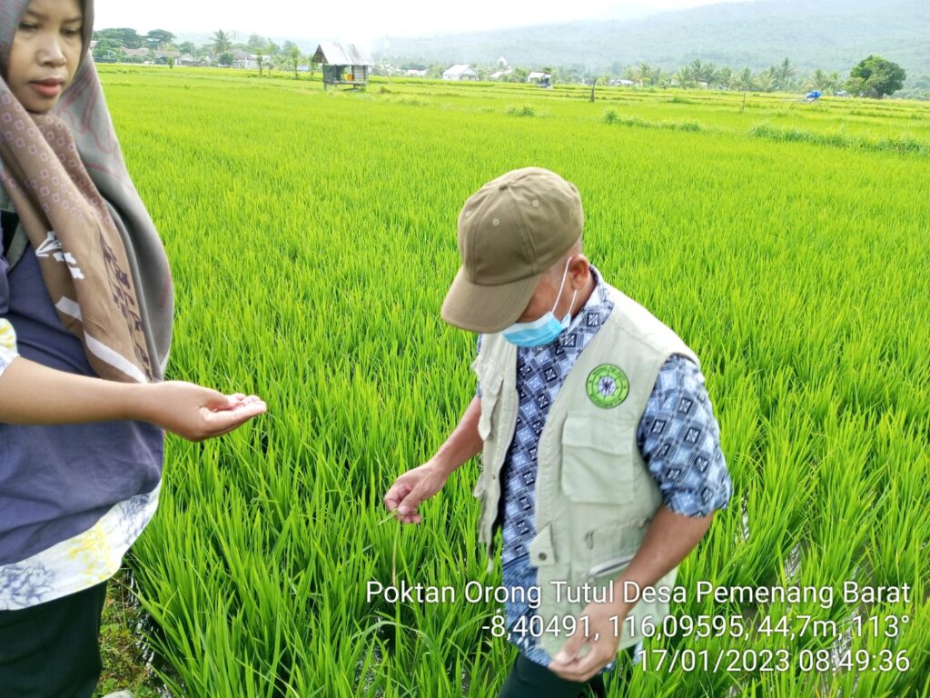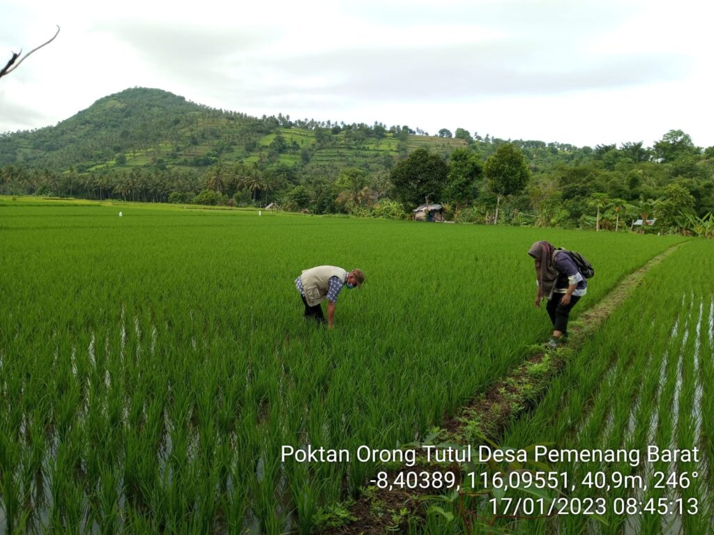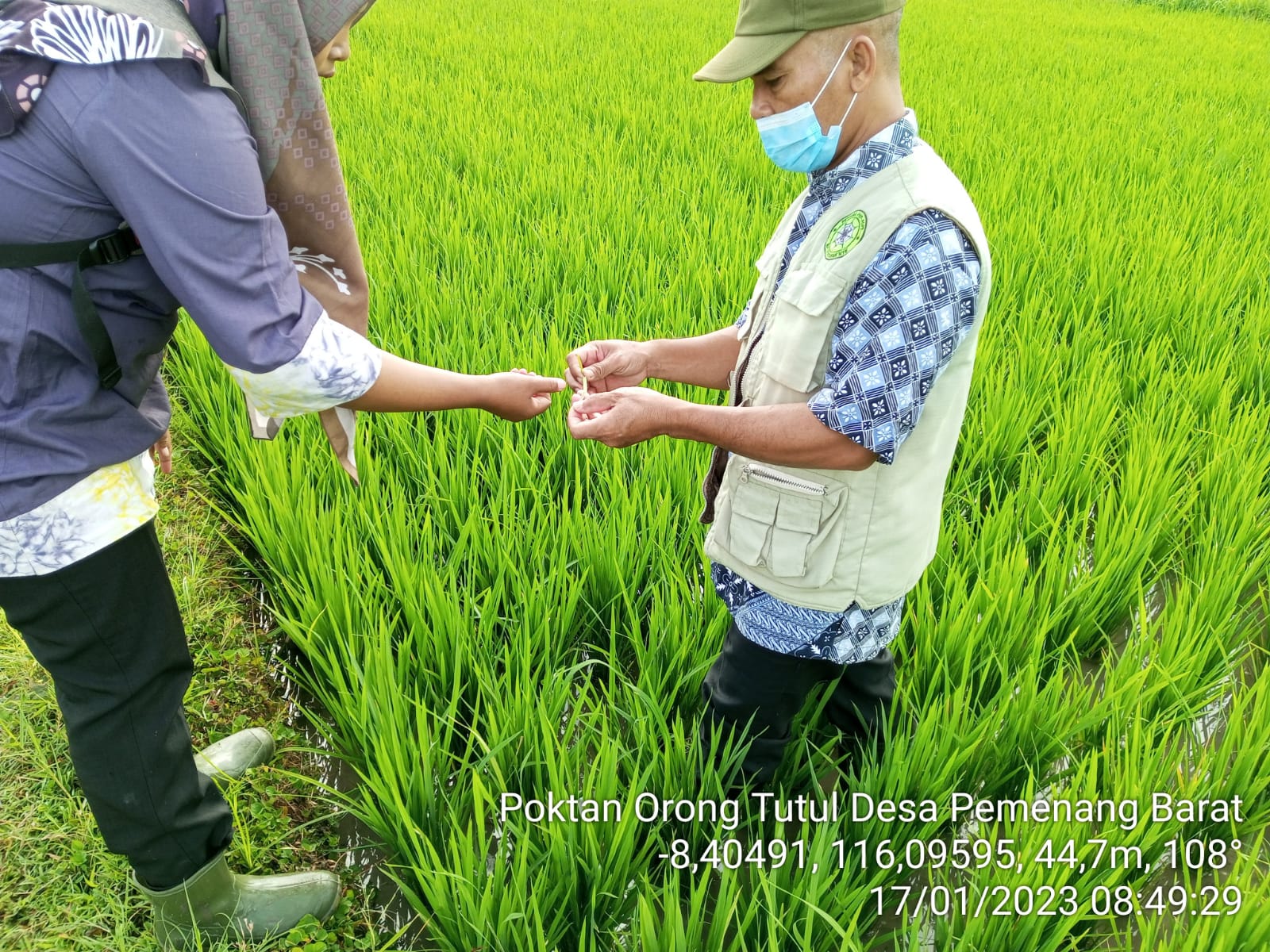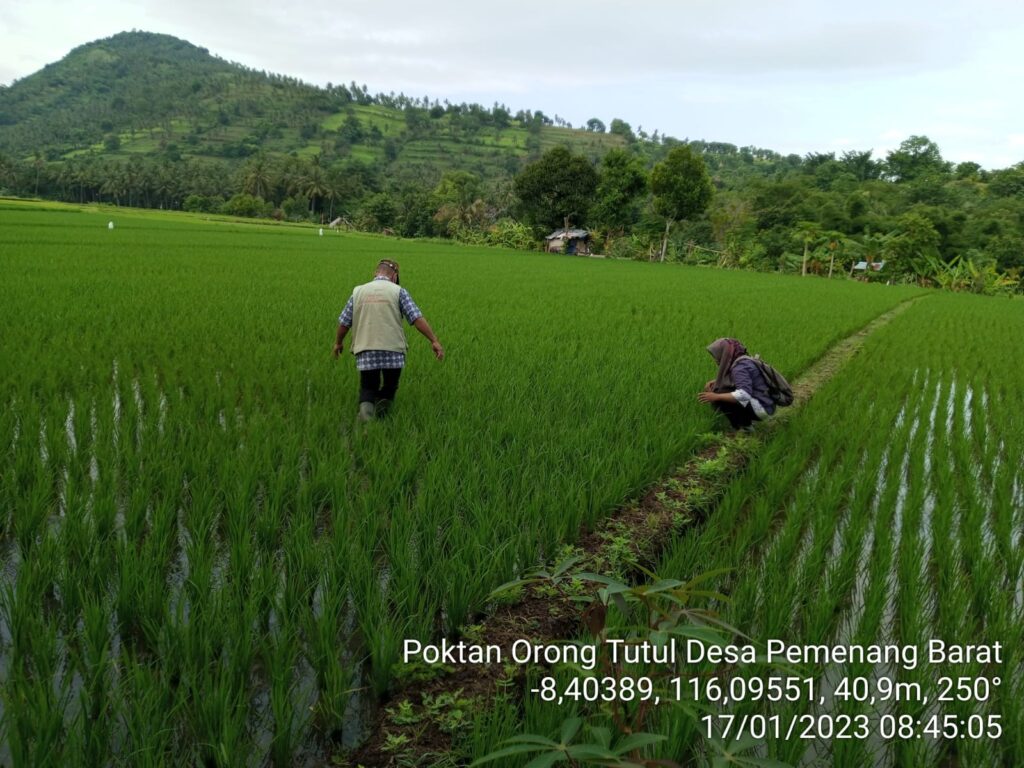 Kegiatan pengamatan keliling atau patroli dalam rangka untuk mengetahui dan menghimpun informasi tentang luas pertanaman terserang OPT (Organisme Pengganggu Tumbuhan), luas pengendalian, luas areal waspada, dan luas kerusakan tanaman akibat DPI (Dampak Perubahan Iklim) yang berlansung pada hari selasa, 17 Januari 2023 di lokasi hamparan kelompok tani Orong Tutul Desa Pemenang Barat Kecamatan Pemenang Kabupaten Lombok Utara.