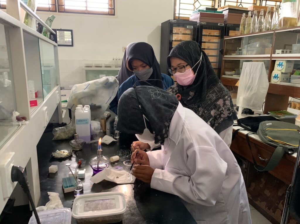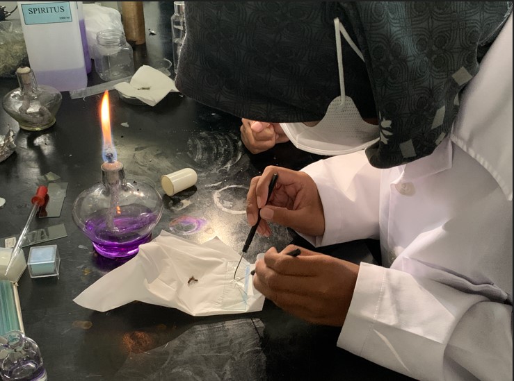 Kegiatan hari ini di LPHP Narmada dilakukan bersama dengan mahasiswa PKL UNRAN adalah pengamatan morfologi jamur entomopatogen yang telah menginfeksi ulat hongkong secara mikroskopis. Langkah pertama yang dilakukan sebelum pengamatan di bawah mikroskop, terlebih dahulu membuat slide/ preparat jamur entomopatogen dengan mengambil sedikit miselium jamur entomopatogen yang melekat di permukaan ulat hongkong.