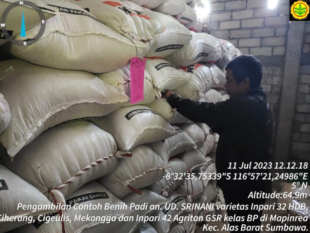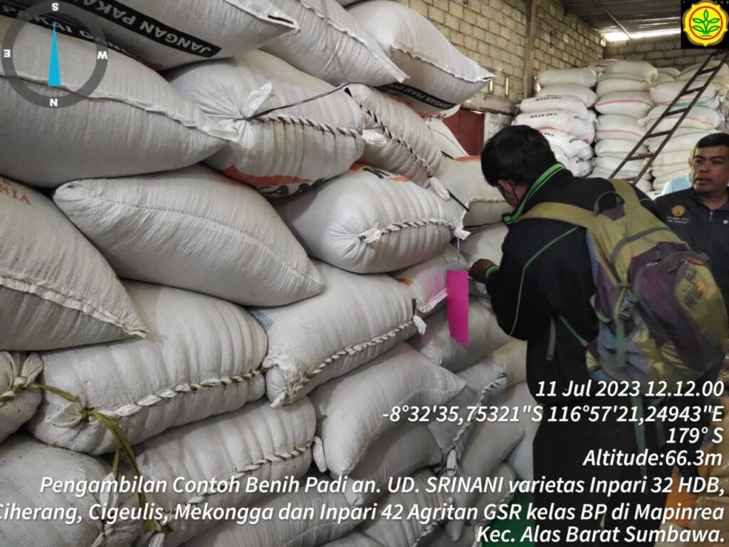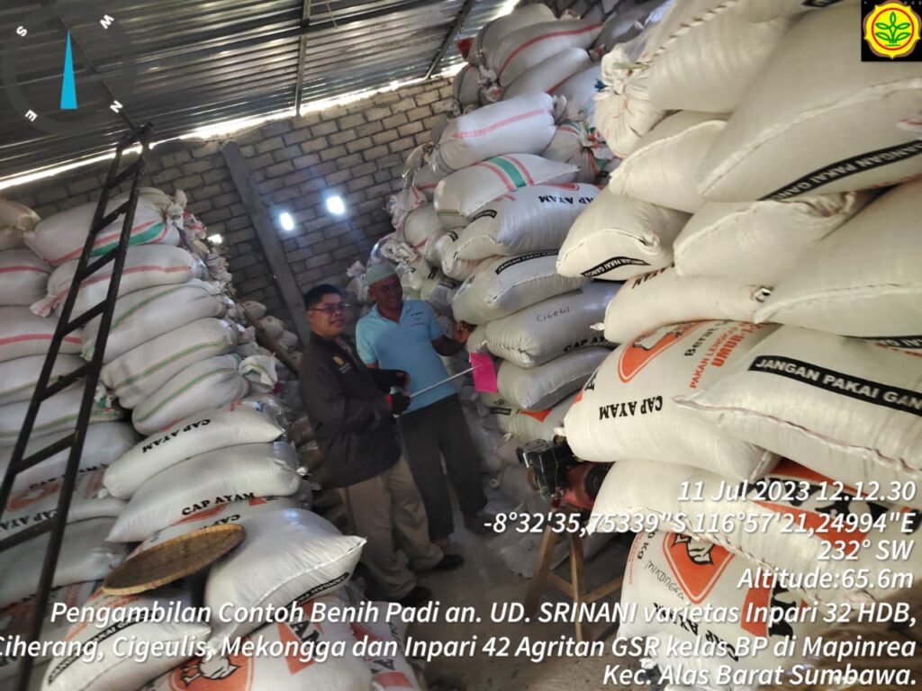 Pengawas Benih Tanaman (PBT) Kabupaten Sumbawa (Bpk Lintang Susanto dan Fathul Jalil Muhtar) melakukan pengambilan contoh benih di gudang milik UD. Srinani yang beralamat di Desa Mapinrea Kecamatan Alas Barat Kabupaten Sumbawa.