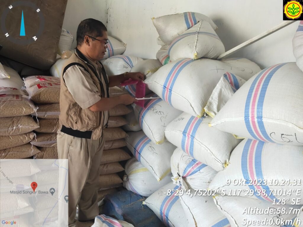 Pengambilan contoh benih Padi produksi MT. 2023 di gudang Produsen Benih Padi an. UD. Azka Raya di Desa Songkar Kecamatan Moyo Utara Kabupaten Sumbawa.