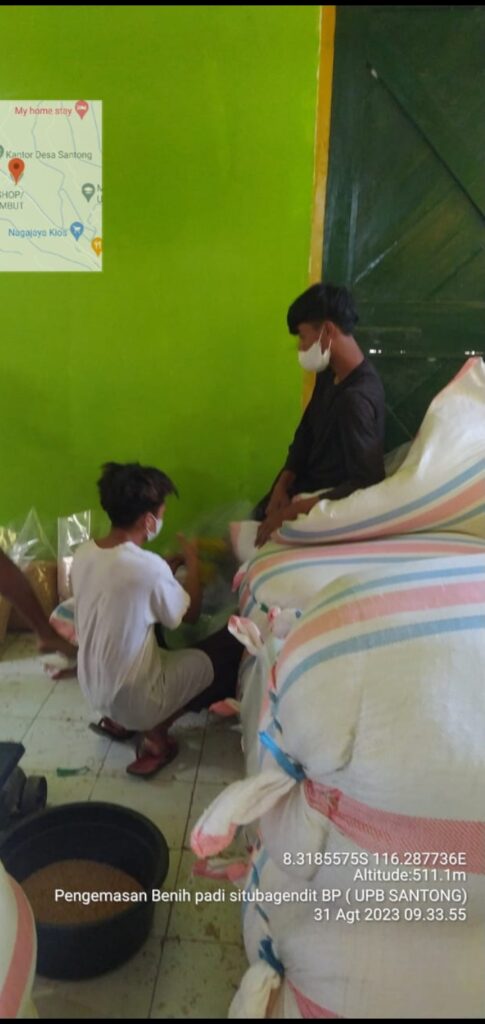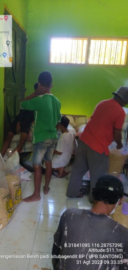 Dimana lokasi kegiatan perbanyakan di desa santong Kec. Kayangan Kab. Lombok Utara yang merupakan hasil kegiatan perbanyakan benih sumber padi musim tanam MK. I 2023, pengantongan calon benih dilakukan untuk mempermudah dalam proses pemasaran benih dan untuk memper tahankan daya tahan simpan benih selama penyimpanan di gudang termasuk menjaga perpormen mutu dan kualitas benih.