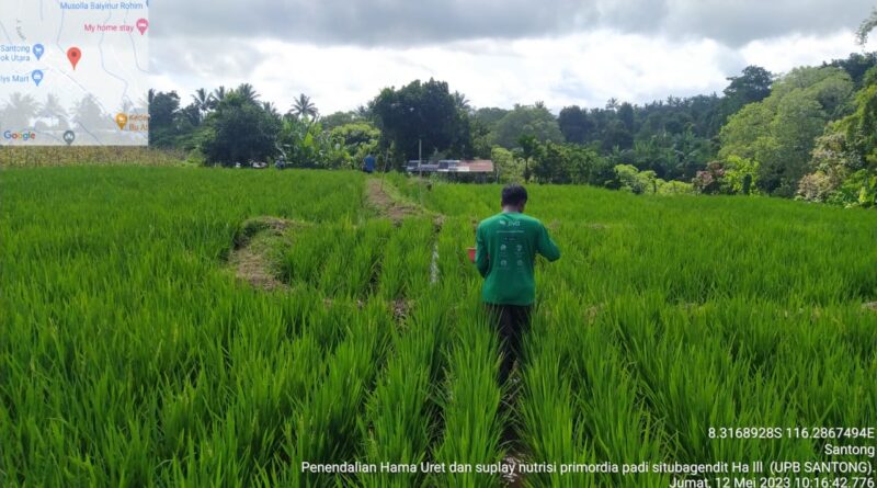 Kegiatan perbanyakan benih sumber padi MK. I 2023 di UPB Santong hari ini Jum’at tanggal 12 Mei 2023 melaksanakan kegiatan Aplikasi Pestisida menggunakan bahan insektisida furadan untuk mengendalikan hama uret dengan cara di tabur di pertanaman padi var. Situ bagendit kelas benih BD-BP seluas 1.0 ha, yang berlokasi di Santong Ds. Santong kec. Kayangan Kab. Lombok Utara.
