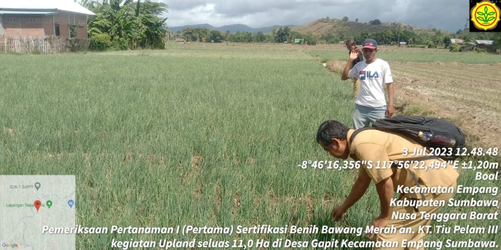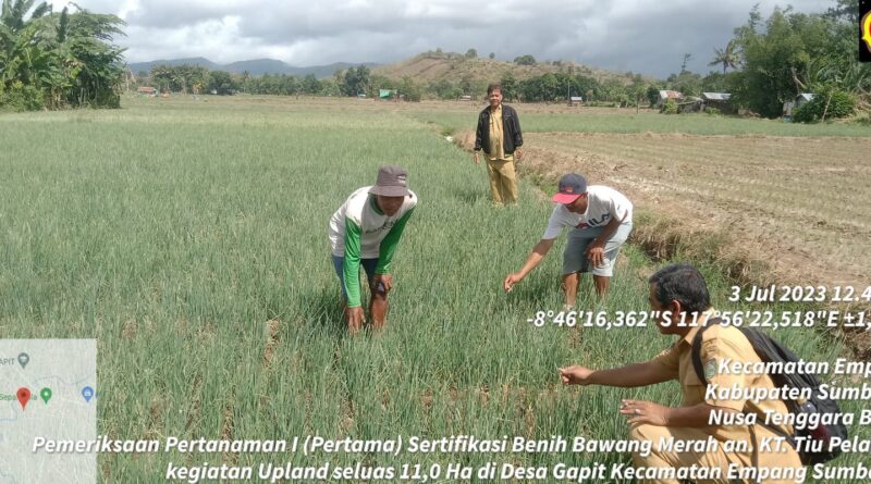 Pengawasan Benih Tanaman Pertanian : Sebagai bagian dari kegiatan Uplaind seluas 11,0 Ha yang bertempat di Desa Gapit Kecamatan Empang kabupaten Sumbawa dengan agenda pemeriksaan Pertanaman Pertama ( I ) Sertifikasi Benih Bawang Merah oleh Pegawas Benih Tanaman (PBT) : Ismaildin, SP yang berkoordinasi dengan Pengawas Benih (PBT) Kabupaten Sumbawa : Lintang Susanto, SP dan Fathul Jalil, S.T.P pada Kelompok Tani Tiu Pelam III.