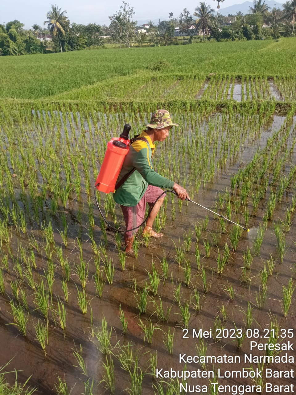 Dalam pelaksanaan kegiatan perbanyakan benih sumber tanaman padi di UPB Peninjauan Narmada pada hari ini Selasa 2 Mei 2023 telah melaksanakan kegiatan aplikasi penyemprotan pestisida pada pertanaman padi varietas Mekongga kelas benih BD-BP seluas 2,0 ha, yang anggarannya bersumber dari anggaran APBD, dalam aplikasi pestisida menggunakan insektisida untuk mengendalikan hama, fungisida mengendalikan penyakit dan ZPT untuk merangsang pertumbuhan tanaman dan sasaran aplikasi untuk mengendalikan serangan hama mapun penyakit pada tanaman tanaman padi yang dilaksanakan oleh tim teknis karyawan UPB Peninjauan yang berlokasi di Peninjauan Narmada Desa. Peresak Kec. Narmada Kab. Lombok Barat. Untuk mencegah dan mengendalikan hama maupun penyakit tanaman termasuk aplikasi pemberian ZPT merangsang pertumbuhan dan perkembangan tanaman.