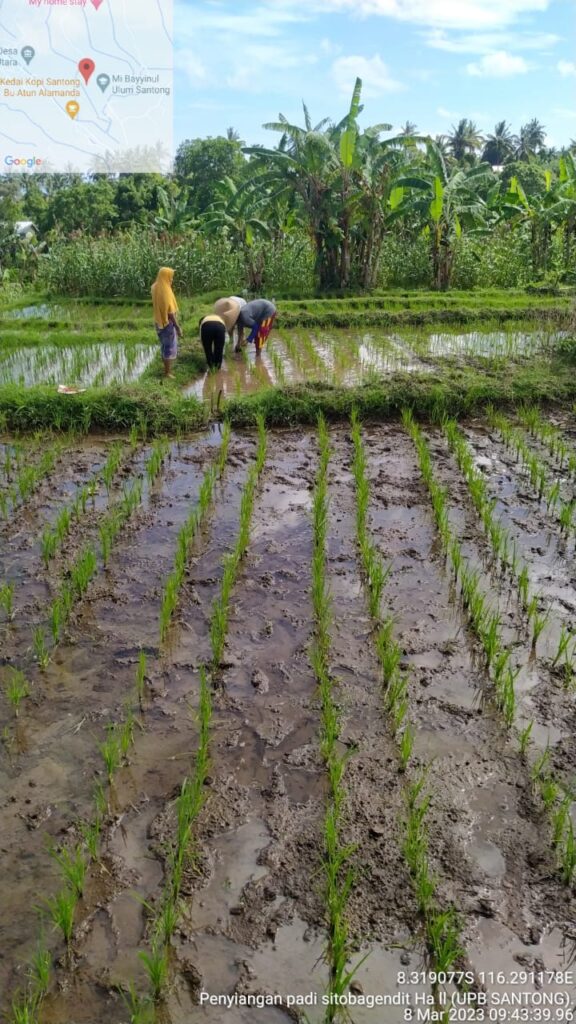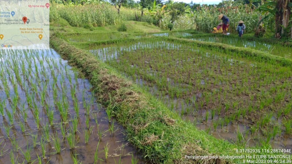 Kegiatan perbanyakan benih sumber padi MK. I 2023 di UPB Santong hari ini Rabu 8 Maret 2023 melaksanakan penyiangan secera manual untuk mengendalikan Gulma di pertanaman padi var. Situ bagendit kelas benih BD-BP seluas 1.0 ha, yang berlokasi di Santong Ds. Santong kec. Kayangan Kab. Lombok Utara.
