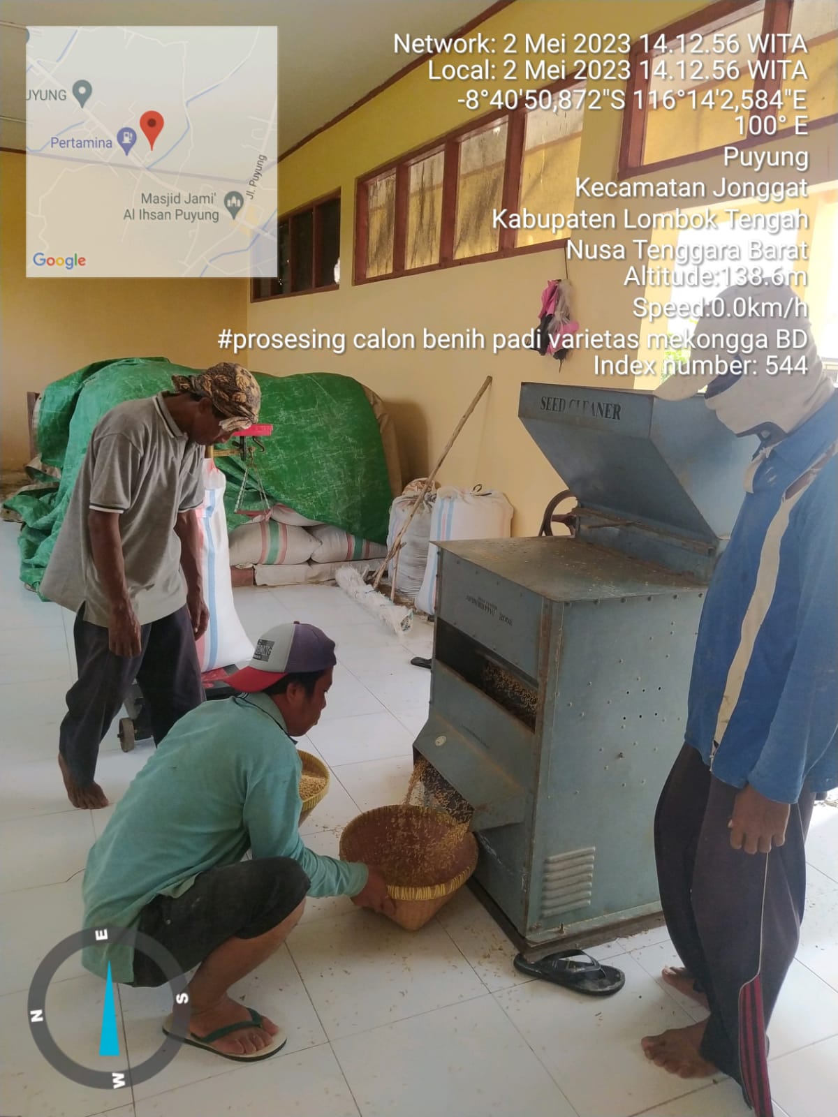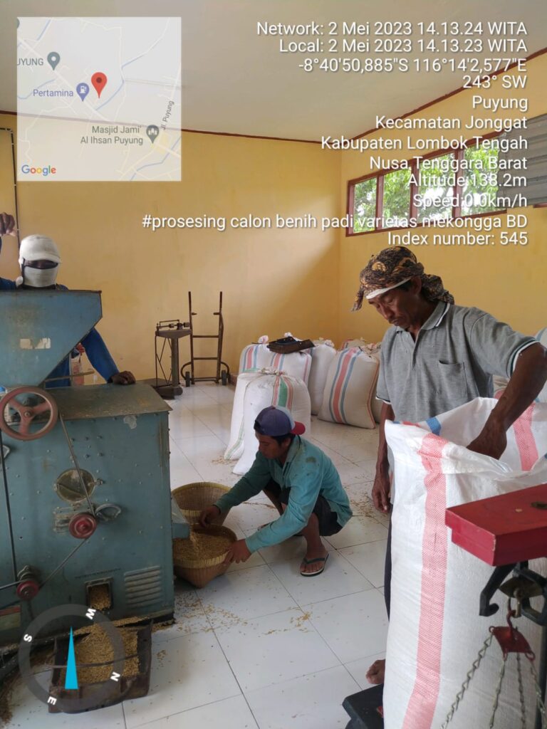 Kegiatan perbanyakan benih padi MH. 2022-2023. Di UPB Puyung hari Selasa / Rabu tanggal 2 /3 Mei 2023 telah melaksanakan kegiatan prosesing /pengipasan benih Padi varirtas Mekongga, Ciliwung dan Inpari 47 dengan kelas Benih BS-BD dari sumber anggaran APBD, total luasan panen seluas 1.5 ha, dilokasi kegiatan perbanyakan benih Puyung Ds.Puyung Kec. Jonggat Kab. Lombok Tengah yang dilaksanakan oleh Karyawan UPB Puyung.