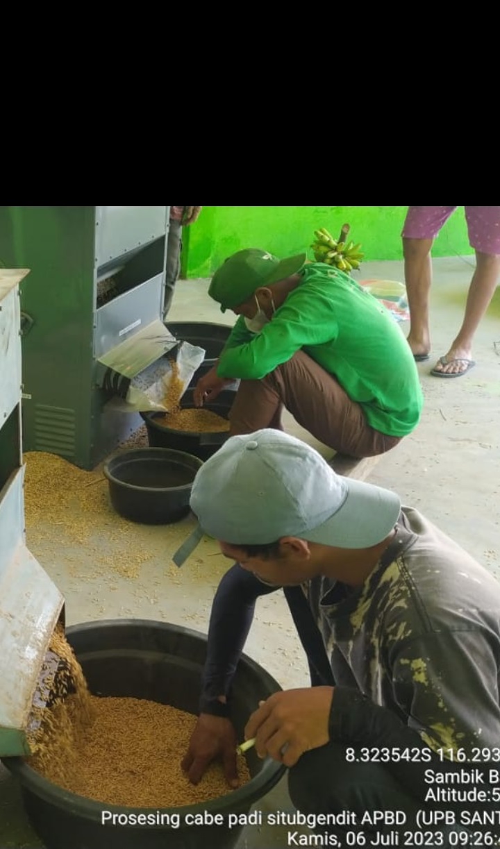 Kegiatan perbanyakan benih padi Hasil kegiatan MH. 2022-2023. Di UPB Santong hari Kamis 6 Juli 2023 telah melaksanakan kegiatan prosesing/ pengipasan benih calon benih padi varirtas Situbagendit kelas Benih BD-BP dari sumber anggaran APBD seluas 3.0 ha.