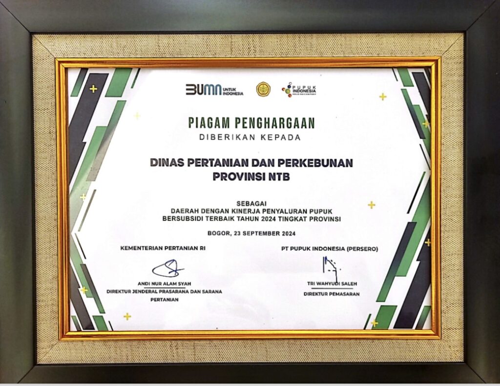 Penghargaan tersebut diserahkan langsung oleh Direktur Pupuk dan Pestisida Bapak Dr. Drs. Jekvy Hendra, M.Si., kepada perwakilan dari Provinsi NTB.